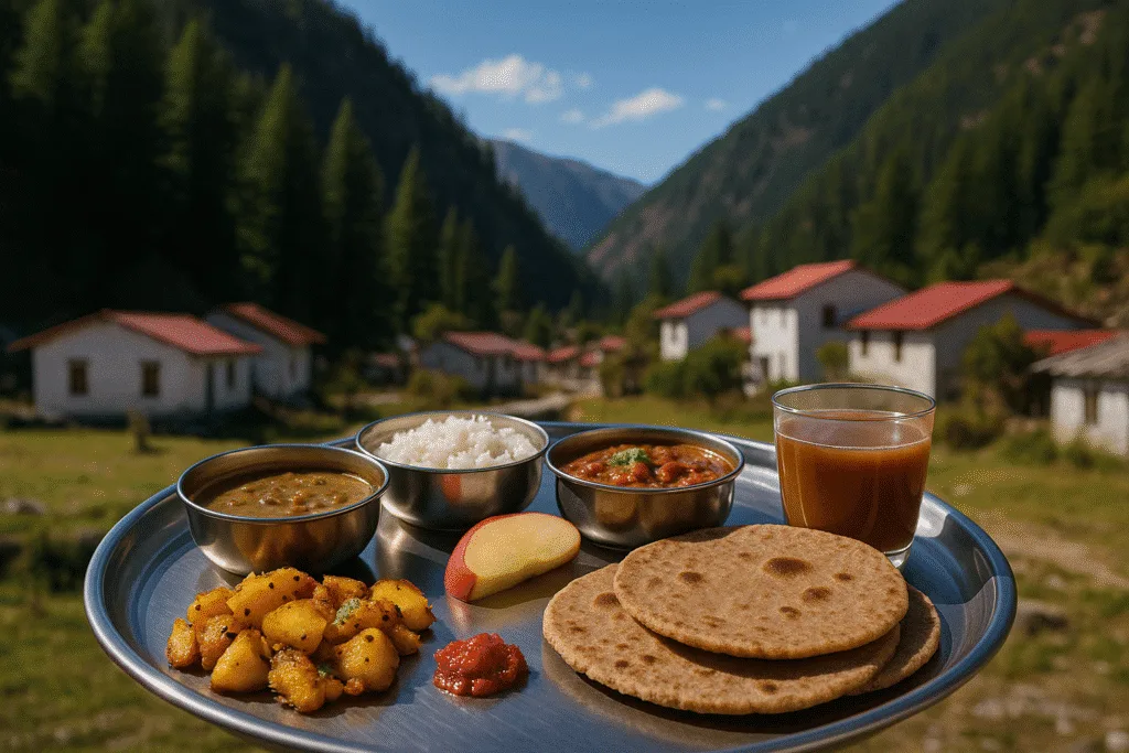 Food in Harsil Valley is simple, warm, and rooted in Garhwali tradition. Since it’s a small mountain village, don’t expect fancy restaurants—most meals are home-cooked and served by locals in guesthouses or small dhabas. You’ll find comforting dishes like Aloo ke Gutke, Mandua (ragi) roti, Phaanu (a lentil dish), and Gahat dal, all served with rice or fresh rotis. During apple season, many stays offer fresh apple juice, chutney, or stewed apples. Hot tea and local rajma-chawal are common comfort meals here, especially during cold evenings. The food is less oily, mildly spiced, and perfectly suited for the cold mountain weather.